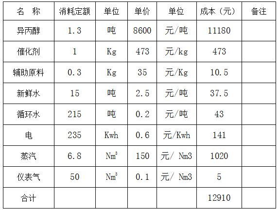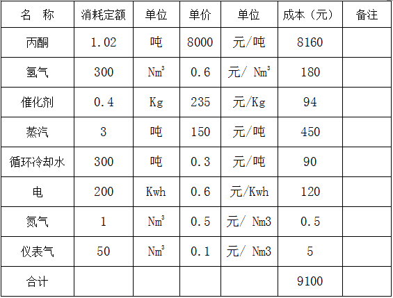 丙酮加氫生產(chǎn)異丙醇過程消耗定額