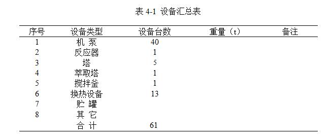 本項(xiàng)目生產(chǎn)裝置工藝設(shè)備共61臺(tái)(套)。各類型設(shè)備見設(shè)備匯總表4-1。