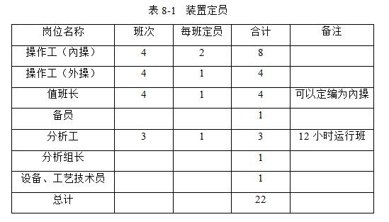 裝置定員不考慮行政管理人員,設(shè)備維修維護(hù)人員。如果裝置自動(dòng)化程度設(shè)置較高,設(shè)備可靠性好,人員可減少。